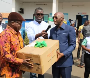 M. Amos BEONAO félicitant la délégation de l’UNACOOPEC.CI. Dame KOFFI, Assistante de Monsieur l’Administrateur Provisoire, à l’extrémité. Le jeudi 8 décembre dernier à Sofitel hôtel Ivoire, M. Issiaka SAVANE, Administrateur Provisoire (AP) de l’UNACOOPEC.CI, a
